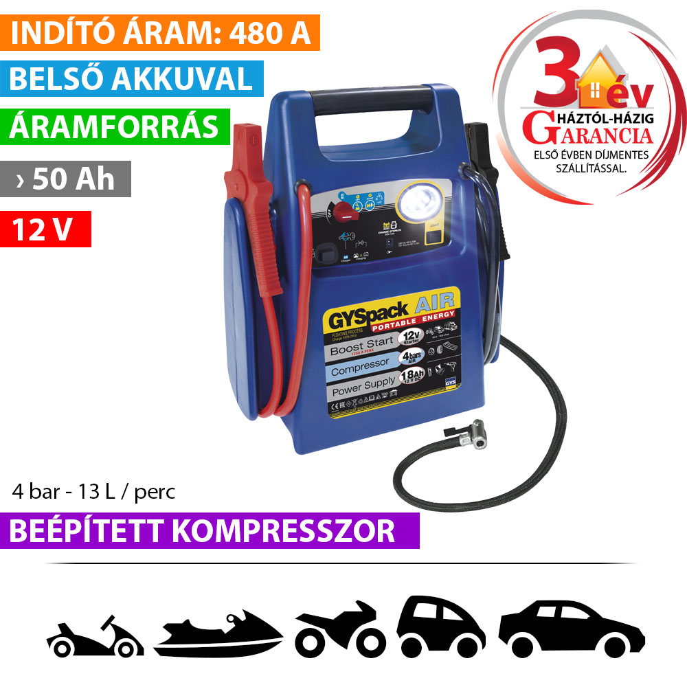 - Ha lemerült az akkumulátor: a GYSPACK AIR azonnal indítja a benzines vagy diesel nehéz gépjárműveket, lakókocsikat, furgonokat (indítóáram 480 A, csúcsáram 1250 A).